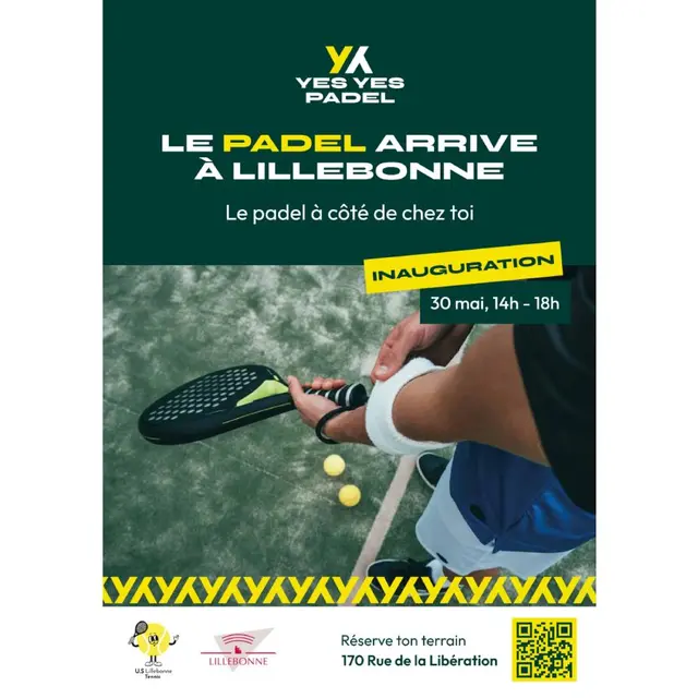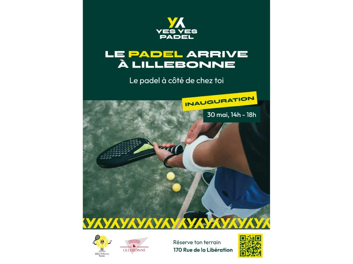 Inauguration des nouveaux terrains de padels au complexe sportif Octave Leclerc à Lillebonne. 14h : ouverture des portes 14h-14h30 : match exhibition avec Manon Arcangioli, Martin Debreux... 14h30 : temps d’inauguration 15h : début des initiations et matchs - Initiations padels - Animation radar - Animation mini tournoi "One point slam" - Lancement de la tombola avec de nombreux lots à gagner (annonce des grands gagnants à 17h30) ! - Et plein d’autres surprises 16h : goûter (buvette accessible toute l'après-midi) 18h : fin de l'évènement. Un évènement organisé en partenariat par l’USL tennis, Yes Yes Padel et la ville de Lillebonne.